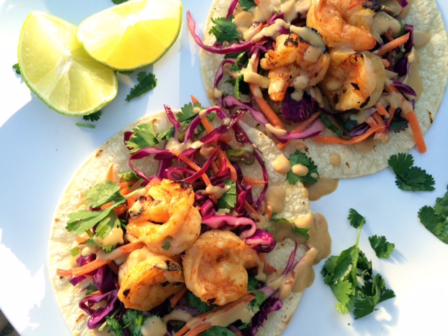 Thai Shrimp Tacos with Asian Slaw & Peanut Sauce